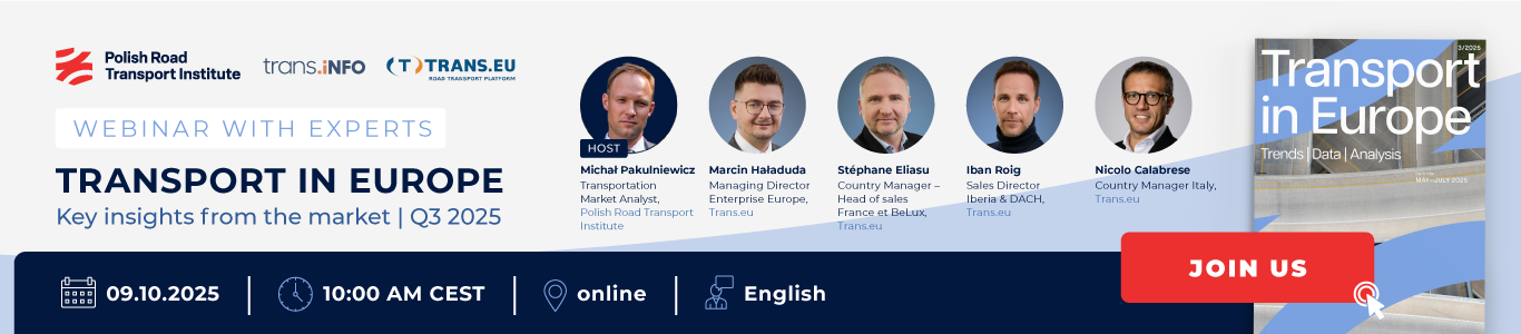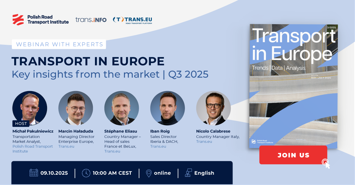 El Instituto Polaco de Transporte por Carretera (PITD) en colaboración con Trans.eu, organizan un webinar exclusivo que tendrá lugar el 9 de octubre y cuyo título es “Transporte en Europa. Perspectivas clave del mercado, T3 2025”